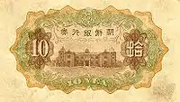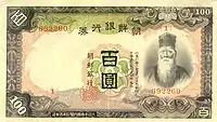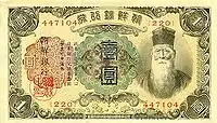 En 1909, la banque de Corée est fondée à Séoul en tant que banque centrale et commence à émettre de la monnaie moderne. Les billets de la banque sont datés de 1909 et émis en 1910 et 1911. Après l'annexion de Corée par le Japon en 1910, la banque de Corée est renommée « Banque de Chosen ». Le premier billet de la banque est daté de 1911 et émis en 1914. Ceux de 1 yen, 5 yen, 10 yen, et 100 yen sont émis régulièrement, tandis que d'autres le sont occasionnellement (5, 10, 20, 50 sen). Celui de 1 000 yen était imprimé mais jamais émis jusqu'à la fin de la Seconde Guerre mondiale. Les premières émissions sont remboursables « en or ou en billets de la banque du Japon ». Cette phrase est plus tard inscrite en japonais sur des billets.