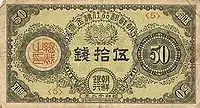 De 1902 à 1910, les billets sont émis par la banque Dai-Ichi Kangyo (en) (« Première banque nationale » du Japon, 株式會社第一銀行, Kabushiki Gaisha Daiichi Ginkō). Il existe des dénominations de 10 sen, 20 sen, 50 sen, 1 yen, 5 yen, et 10 yen. Les billets de sen sont verticaux et ressemblent à ceux des yen japonais de 1872 et du yen militaire japonais vers 1900. Ces billets sont remboursables en « monnaie japonaise de n'importe laquelle de ses branches en Corée ».