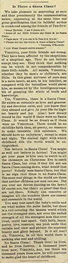 « Is There a Santa Claus? » (« Y a-t-il un Père Noël ? ») fut le titre d'un article de la page rédaction du New York Sun du . Celui-ci est devenu partie des traditions de Noël aux États-Unis de par sa célèbre réplique « Yes, Virginia, there is a Santa Claus » (« Oui, Virginia, il y a un Père Noël »).