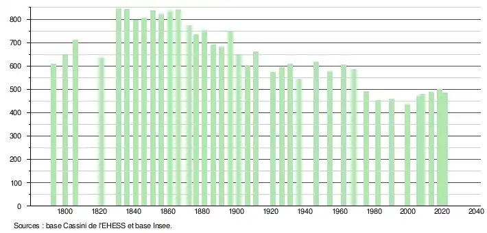 L'évolution du nombre d'habitants est connue à travers les recensements de la population effectués dans la commune depuis 1793. Pour les communes de moins de 10 000 habitants, une enquête de recensement portant sur toute la population est réalisée tous les cinq ans, les populations légales des années intermédiaires étant quant à elles estimées par interpolation ou extrapolation[24]. Pour la commune, le premier recensement exhaustif entrant dans le cadre du nouveau dispositif a été réalisé en 2008[25].