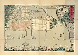 Elle doit son développement à l'activité importante de son port et à ses contacts avec l'étranger avant même la fin de la période d'isolationnisme imposée par le shogunat Tokugawa, qui se traduisent d'ailleurs par la présence d'importantes communautés étrangères, notamment chinoise.