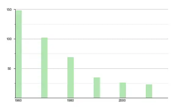 | 1980 | 69 | ▼ −32,35 % | |