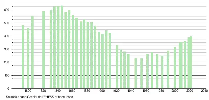 L'évolution du nombre d'habitants est connue à travers les recensements de la population effectués dans la commune depuis 1793. Pour les communes de moins de 10 000 habitants, une enquête de recensement portant sur toute la population est réalisée tous les cinq ans, les populations légales des années intermédiaires étant quant à elles estimées par interpolation ou extrapolation[26]. Pour la commune, le premier recensement exhaustif entrant dans le cadre du nouveau dispositif a été réalisé en 2008[27].