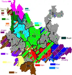 | Groupes ethniques | Hans (67 %) Yi (11 %) Bai (3,6 %) Hani (3,4 %) Zhuang (2,7 %) Dai (2,7 %) Hmong (2,5 %) Hui (1,5 %) Blang (0,2 %) Achang (0,1 %) |