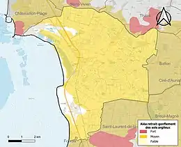 Le retrait-gonflement des sols argileux est susceptible d'engendrer des dommages importants aux bâtiments en cas d’alternance de périodes de sécheresse et de pluie. 89,2 % de la superficie communale est en aléa moyen ou fort (54,2 % au niveau départemental et 48,5 % au niveau national). Sur les 773 bâtiments dénombrés sur la commune en 2019, 271 sont en aléa moyen ou fort, soit 35 %, à comparer aux 57 % au niveau départemental et 54 % au niveau national. Une cartographie de l'exposition du territoire national au retrait gonflement des sols argileux est disponible sur le site du BRGM[19],[Carte 2].