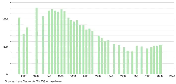 L'évolution du nombre d'habitants est connue à travers les recensements de la population effectués dans la commune depuis 1793. Pour les communes de moins de 10 000 habitants, une enquête de recensement portant sur toute la population est réalisée tous les cinq ans, les populations légales des années intermédiaires étant quant à elles estimées par interpolation ou extrapolation[31]. Pour la commune, le premier recensement exhaustif entrant dans le cadre du nouveau dispositif a été réalisé en 2005[32].