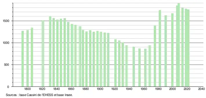 L'évolution du nombre d'habitants est connue à travers les recensements de la population effectués dans la commune depuis 1793. Pour les communes de moins de 10 000 habitants, une enquête de recensement portant sur toute la population est réalisée tous les cinq ans, les populations légales des années intermédiaires étant quant à elles estimées par interpolation ou extrapolation[32]. Pour la commune, le premier recensement exhaustif entrant dans le cadre du nouveau dispositif a été réalisé en 2008[33].