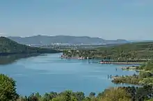 Réservoir d'Ullíbarri-Gamboa (es), vu depuis la sierra d'Elgea. En arrière-plan, la ville de Vitoria-Gasteiz