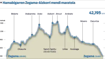 Le parcours forme une boucle autour du village de Zegama[5] et traverse le massif d'Aratz et la cordillère d'Aizkorri par des sentiers techniques alternants entre forêt et prairie d'altitude. Les 7 premiers kilomètres jusqu'à Otzaurte sont parcourus sur un sentier en forêt, une première côte d'environ 500 m de dénivelé[6] est gravie sur un sentier souvent très boueux. Du kilomètre 7 au kilomètre 16,5 les coureurs effectuent l'ascension de l'Aratz (1 443 m) qui constitue le premier point haut de l’épreuve. Une descente de 3 km amène les concurrents au pied de la côte de Sancti Spiritu. La côte de Sancti Spiritu, longue de 2,5 km pour 550 m de dénivelé constitue le moment le plus intense de la course. Les coureurs montent sur un sentier en terre dans une prairie d'altitude, ils sont entourés de centaines de spectateurs formant une véritable marée humaine qui couvre par ses encouragements le bruit de la respiration des concurrents. Ce passage participe à rendre cette course réputée au niveau international. Peu après le parcours atteint son point culminant (Aitxuri, 1 551 m et point culminant du Pays-Basque) au kilomètre 23. Entre le kilomètre 23 et le kilomètre 30 les coureurs évoluent dans des prairies d'altitude sur des sentiers pierreux particulièrement techniques. Les 12 derniers kilomètres forment la partie descendante finale en forêt.