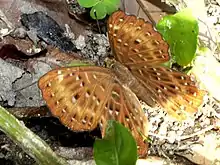 Ce papillon de couleur orange à marron cuivré est caractérisé par les dessins formés par les veine orange sur une partie basale et discale marron roux alors que l'aire submarginale est orange. Sa seconde caractéristique ce sont les lignes d'ocelles marron centrés de blanc parallèles à la ligne submarginale.