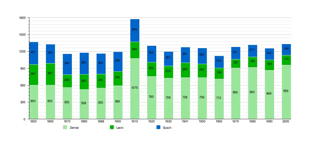 En , Zernez avait une population de 1 506 habitants[1]. En 2013, 18,6 % de la population étaient des ressortissants étrangers résidents. Au cours des années 2010-2013, la population a changé à un taux de 1,14 %. Le taux de natalité dans la municipalité, en 2013, était de 8,7 tandis que le taux de mortalité était de 6,9 pour mille habitants[8].