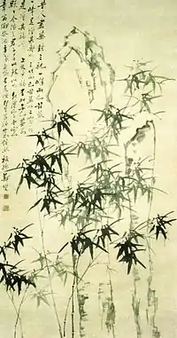 À la dynastie des Yuan, Zhao Mengfu inscrit un poème sur une peinture de rochers et bambous, qui déclare en conclusion que calligraphie et peinture sont identiques. Les artistes ultérieurs ne partagent pas cette opinion, mais cultivent plutôt un style calligraphique personnel et distinctif, que reflètent naturellement leurs peintures. Dans certaines œuvres, le poème inscrit sur la peinture est essentiel à la création d'un effet visuel. Dans Bambous et rocher de Zheng Xie par exemple, les lignes et graduations de gris de la calligraphie évoquent les lignes de contour du rocher. Dans Poisson nageant de Li Fangying (1695-1754), le poème s'étire verticalement à la manière d'une berge[1].