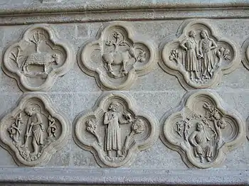 ![]() Partie extérieure (gauche) du soubassement gauche du portail Saint-Firmin |