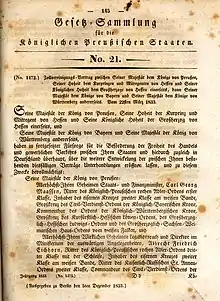 | Prusse | 1834 | Anhalt-Bernbourg : ensemble du duché[31] Anhalt-Dessau : ensemble du duché[31] Anhalt-Köthen : ensemble du duché[31] Waldeck Lippe-Detmold Saxe-Cobourg et Gotha : pour le bailliage de Volkenrode[31] Hesse-Hombourg : pour le grand-bailliage de Meisenheim[31] Odenbourg : pour la principauté de Birkenfeld[31] |