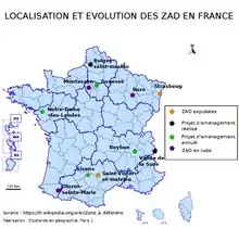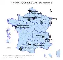 L'installation des premiers zadistes à Notre-Dame-des-Landes a commencé en 2009, à la suite de l'organisation d'un Camp Action Climat[15]. Les ZAD se sont multipliées en France après l'expulsion manquée de celle de Notre-Dame-des-Landes à l'automne 2012[16]. L'une des premières à se monter après l'échec de l'évacuation de la ZAD serait la ferme des Bouillons, près de Rouen, occupée contre un projet immobilier du groupe Auchan[17] dès l'hiver 2012. Outre le cas de la ZAD de Notre-Dame-des-Landes, les cas les plus connus sont ceux de l'opposition au projet du barrage de Sivens, dans le Tarn, au Center Parcs de la forêt de Chambaran, en Isère et au Grand Contournement Ouest de Strasbourg. Avant l'expulsion réussie de plusieurs d'entre elles, la France a compté au maximum une quinzaine de ZAD, dont moins de la moitié sont ou étaient des ZAD « pleines » (Notre-Dame-des-Landes, Sivens, Roybon, les ZAD des Bouillons près de Rouen, Saint-Victor-et-Melvieu, Avignon, Décines), avec un nombre d'occupants permanents variant entre 200 et 300[15].