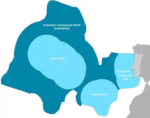 Le Portugal a présenté une demande pour étendre sa juridiction sur 2 150 000 kilomètres carrés additionnels du plateau continental voisin en [2] résultant en une ZEE de plus de 3 877 408 km2.