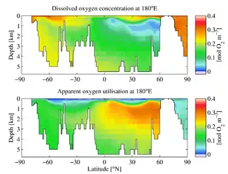 C'est aux profondeurs intermédiaires et dans les eaux riches en nutriments et organismes que les taux les plus élevés de consommation d'oxygène sont observés (comme il est indiqué ci-dessous).