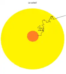 Tel que son nom l'indique, le mode de transport radiatif intervient dans la zone radiative[11]. Puisque la matière y est suffisamment dense, les photons émis par le noyau sont constamment absorbés par les électrons libres et les atomes présents dans le gaz ionisé de la zone radiative. Ces photons sont alors réémis, puis réabsorbés par d'autres électrons et d'autres atomes[12]. Ce processus se produit à répétition jusqu'à la surface de la zone radiative. Comme le phénomène d'absorption et de réémission est aléatoire, il ne favorise pas la direction vers l'extérieur de la zone radiative[13]. C'est pourquoi la durée du trajet d'un photon à l'intérieur de la zone radiative est estimé entre quelques milliers et quelques millions d'années, en fonction de la taille, de la densité et de la composition de l'étoile.