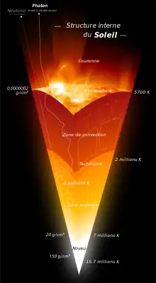 La zone radiative solaire s'étend du centre de l'étoile jusqu'à la tachocline, à environ 72 % du rayon solaire[14]. La zone située du centre jusqu'à environ 25 % du rayon solaire est connue sous le nom de noyau[15].