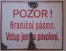 Panneau de la République socialiste tchécoslovaque utilisé dans les années 1980 informant de l'entrée en zone frontalière. Le texte dit, « Zone frontalière AVERTISSEMENT ! N'entrez qu'avec une autorisation »