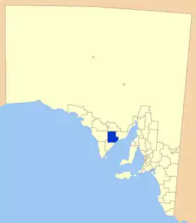 | District de Coorong | Meningie | 1995 | 8833 | 0,6 | 5 602 | 5 463 | Fusion des Districts de Coonalpyn-Downs, Peake et Meningie. | ![]() |
