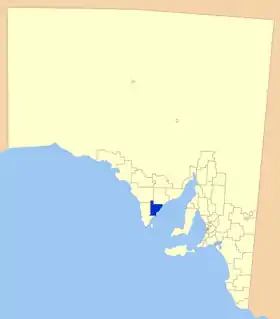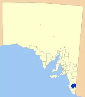 | District de Grant | Mount Gambier | 1996 | 1898 | 4,5 | 7 993 | 8 511 | Fusion des districts de Mount Gambier et de Port MacDonnell. | ![]() |
