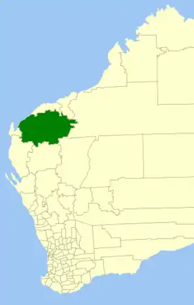 | Comté de Derby-West Kimberley | Derby | 1884 | Le "West Kimberley Road Board" (1884) fut renommé en 1983. | 104 080 km² | ![]() |