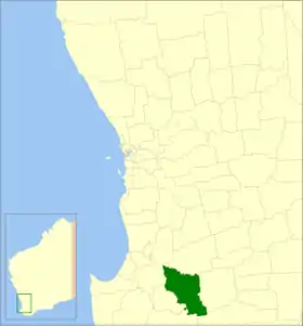 | Comté de Manjimup | Manjimup | 1909 | La région fut d'abord partagée entre les Plantagenet, Wellington et Sussex Road Districts en 1871. Plus tard elle sera comprise dans le Nelson Road Board District. le , le "Warren Road Board" fut créé et en 1925 devint le Manjimup. | 7 027 km² | ![]() |