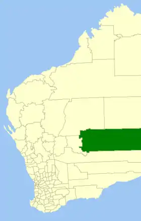 | Comté de Wiluna | Wiluna | 1909 | Le "Wiluna Road Board" fut créé en 1909. On 1er juillet 1993, the eastern half of the Shire abutting the State's border with the Northern Territory was incorporated as the Shire of Ngaanyatjarraku. | 184 000 km² | ![]() |