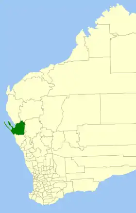 | Comté de la vallée Chapman | Nabawa | 1958 | Le "Upper Chapman Road Board" fut créé en 1901. En 1958, il devint le "Chapman Valley Road Board". | 4 007 km² | ![]() |