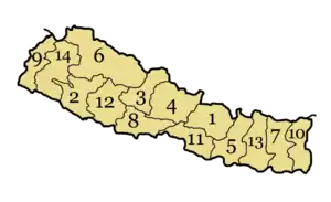 Le Népal était subdivisé jusqu'en 2015 en 14 zones administratives (अञ्चल, añcal, transcrit par « anchal ») :