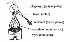 L'alambic typique de Zosime, tel que représenté sur le dessin annoté fig. 5, est constitué d'un foyer sur lequel repose une cucurbite (lopas), dans laquelle se trouve le produit à distiller, surmonté d'un chapiteau (phialè qui donnera en français « fiole ») dans lequel s'effectue la condensation des vapeurs des substances que l'on désire extraire. Un tuyau permet de récupérer le distillat dans un récipient. Les alambics étaient fait en terre-cuite, en verre ou en métal. Ils servaient à distiller des composés sulfureux, arsénieux et mercureux et ne pouvaient distiller des liquides volatils[24]. La distillation du vin et de produit fermenté pour donner des eaux-de-vie ne s'est développée que beaucoup plus tard: l'invention de l'alcool se place à Salerne[24] (Italie du sud) au XIIe siècle.