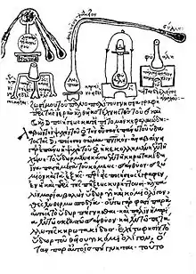 Dans ses Mémoires authentiques, Zosime[18] décrit et donne des dessins de plusieurs appareils à distiller (à un, deux ou trois becs).