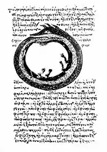 Selon Michèle Mertens, « attesté aussi en Mésopotamie, l'ourobore se rencontre surtout en Égypte, et ce depuis une période très ancienne : il est déjà mentionné dans les Textes des Pyramides. Les premières représentations figurées remontent à la XVIIIe dynastie.» Auprès des gnostiques[32], il symbolise « le cycle de tout devenir avec son double rythme : le développement de l'Un dans le Tout et le retour du Tout à l'Un ». Zosime est le premier alchimiste à faire usage de l'ourobore.