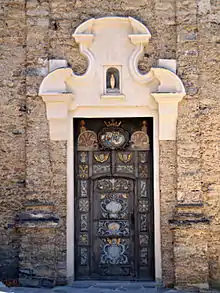 - la porte d'entrée, en bois taillé, peint, polychrome, avec une iconographie de l'Annonciation, datée du 3e quart XVIIIe siècle (exécutée vers 1760). Monument historique par arrêté du [21] ;