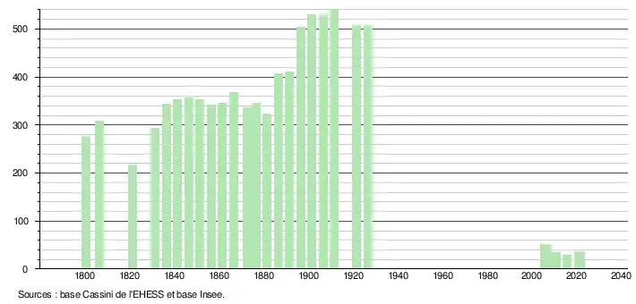 L'évolution du nombre d'habitants est connue à travers les recensements de la population effectués dans la commune depuis 1800. Pour les communes de moins de 10 000 habitants, une enquête de recensement portant sur toute la population est réalisée tous les cinq ans, les populations légales des années intermédiaires étant quant à elles estimées par interpolation ou extrapolation[18]. Pour la commune, le premier recensement exhaustif entrant dans le cadre du nouveau dispositif a été réalisé en 2005[19].