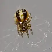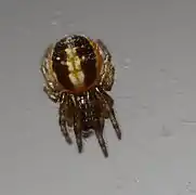 Le prosome est brun jaune avec un motif gris brun (le milieu un peu argenté) en forme de feuille sur l'opisthosome.
