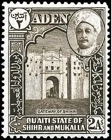 Timbre-poste de 1942 représentant le sultan et la porte de la ville de Shihr avec l’inscription en anglais de l’État Qu'aiti de Shihr et Mukalla.