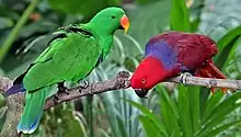 La femelle éclectus a un plumage rouge et bleu tandis que le mâle est dans l'ensemble vert.