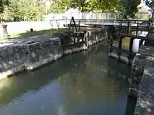 - Anglais : lock (en) (1) ; sluice (en) (2), sluice-gate (en) (2)