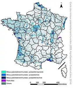 12 987 000 hectares sont ici des « potentiellement humides » (23,2 % du territoire) mais les zones humides potentielles de plateau, de pente et de zones karstiques, difficiles à modéliser sont sous-estimées[2].