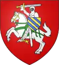 - De gueules au cavalier armé, casqué et cuirassé d’argent, éperonné d’or, brandissant de sa main dextre une épée d’argent garnie d’or posée en fasce, tenant sur son bras senestre un écu d’or à trois bandes d’azur, chevauchant un cheval cabré d’argent, bridé, sellé, harnaché de sinople et morsé d’or, qui est d’Ernies de la Somme → voir illustration « cavalier éperonné »