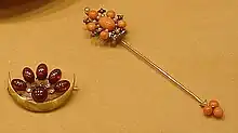 - (Bijouterie) Bijou, sorte de broche, destinée à être épinglée sur une cravate, en particulier à l'époque où elles n'étaient pas nouées comme actuellement (voir photo du dandy et du jeune homme).