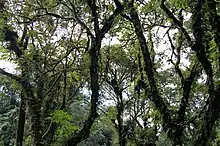 Ces arbres atteignent 25 à 30 mètres de haut et ils sont associés à un sous-bois abondant, à des lianes et à des plantes épiphytes.