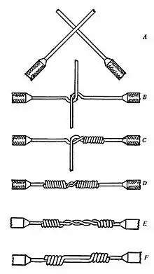 - (Marine) Jonction, assemblage de deux bouts de corde ou de câble métallique par l’entrelacement de leurs torons.