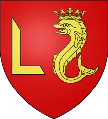 - De gueules à l’équerre d’or à dextre l’angle dirigé vers le canton dextre de la pointe, senestrée d’un dauphin couronné d’or, qui est de la commune de Robion du Vaucluse → voir illustration « armoiries avec une équerre »