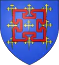 - D’azur à neuf croix recroisetées au pied fiché d’or disposées 3.3.3 au tétragone bastionné et évidé de gueules en abîme, qui est de Doncourt-lès-Longuyon → voir illustration « tétragone évidé »