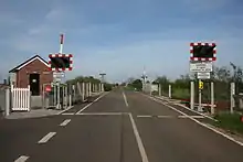 - (Chemin de fer) Passage à niveau.