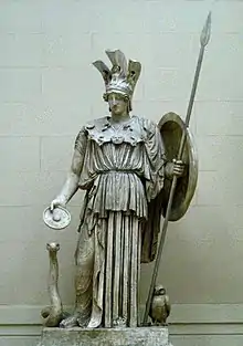 - Au départ, un simple qualificatif de la déesse Ἀθηνᾶ (« Athéna »), souvent représentée une lance à la main (voir illustration) et dérivé de πάλλω, pállō (« brandir une lance, lancer, balancer ») : « Athéna qui brandit ». Mais il pourrait s’agir d’une étymologie populaire et la représentation dérivée d’une association postérieure, le mot est peut-être apparenté à πάλλας, πάλλαξ, παλλακή (« jeune gens, jeune fille ») avec le sens religieux de « Vierge »[1].