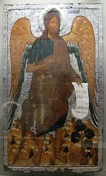 - (Art) Embossage, plaque métallique embossée qui sert de cadre aux icônes religieuses.